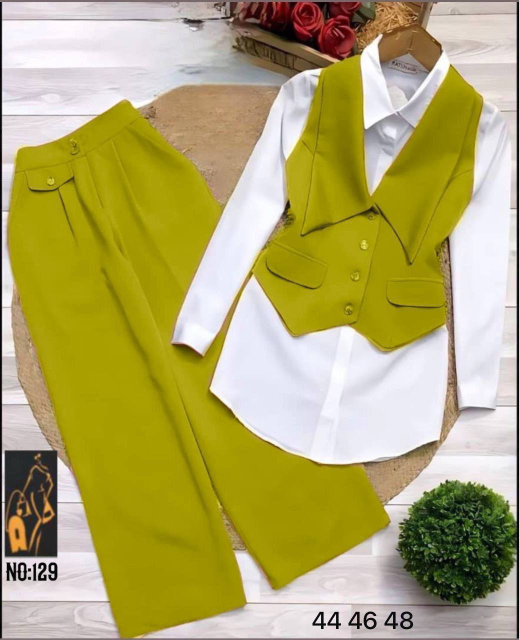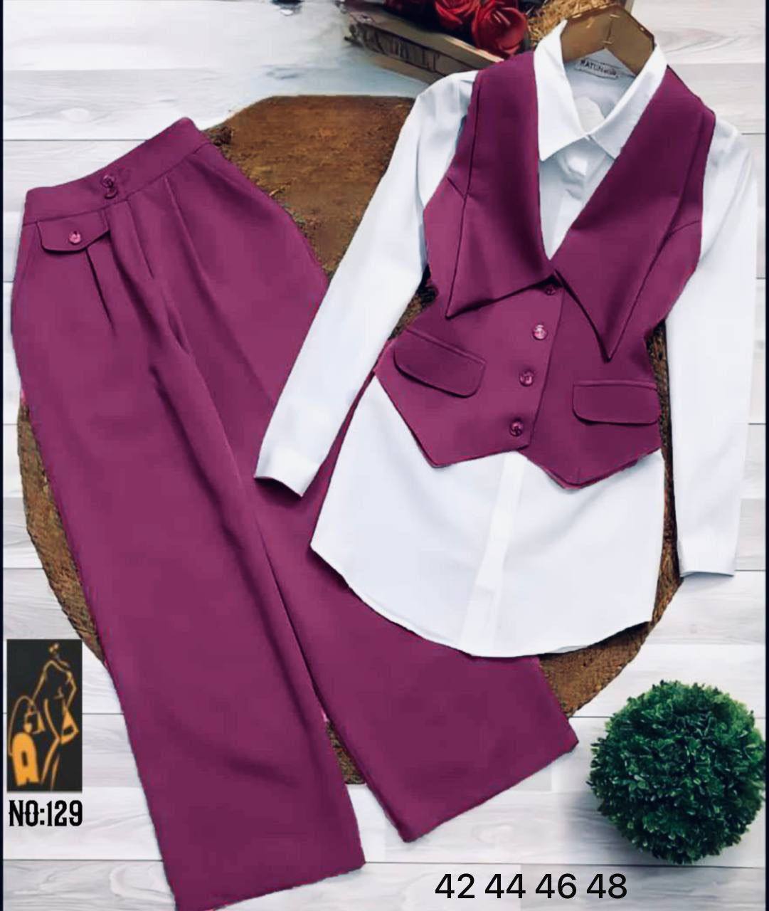 Apportez une touche de sophistication à votre dressing avec cet ensemble femme 3 pièces, idéal pour les occasions spéciales, les sorties pro ou un look chic du quotidien. Il se compose d’une chemise blanche à col classique, d’un gilet cintré boutonné et d’un pantalon large taille haute parfaitement assorti.