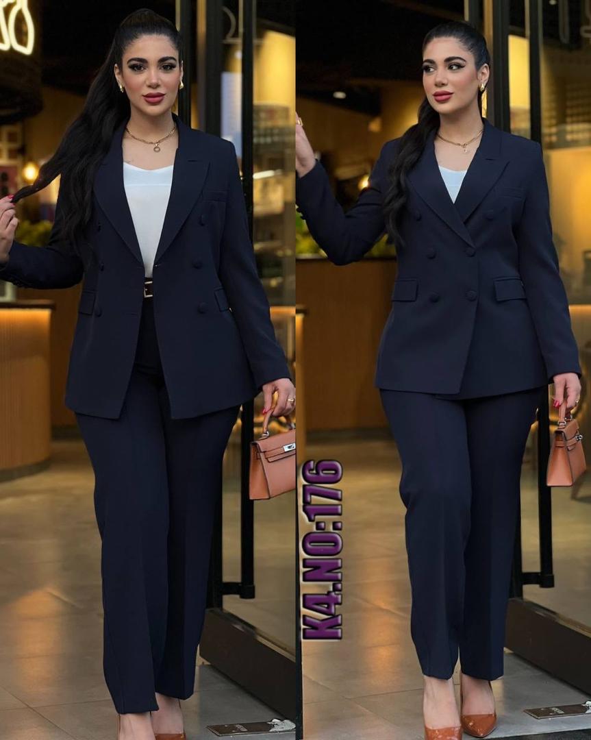 Composé d’un blazer croisé à double rangée de boutons et d’un pantalon droit, cet ensemble est parfait pour les femmes qui veulent un look formel, classe et impactant.