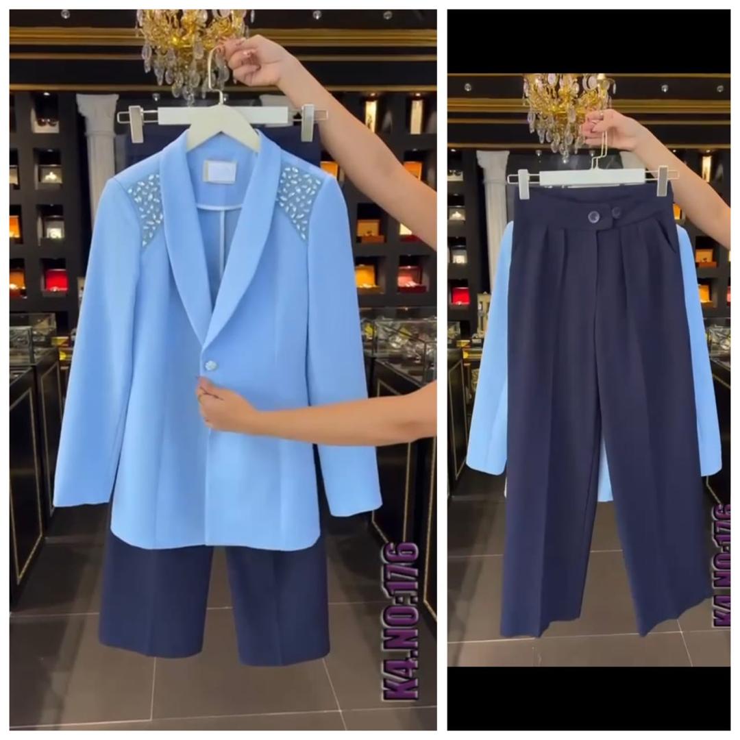 Un ensemble classe et original avec veste bleu ciel perlée sur les épaules, accompagné d’un pantalon marine droit. Une tenue élégante et pleine de caractère.